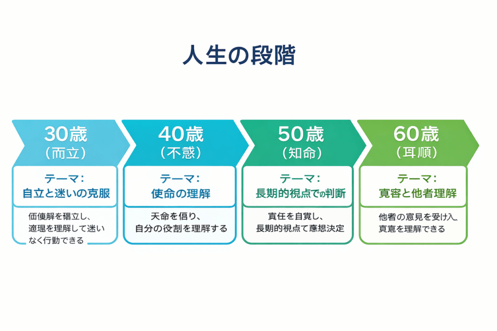 • 30〜40歳(而立 → 不惑):テーマは、自立と迷いの克服。自分軸を確立し、迷わず行動できるようになる。学問や経験を通じて自分軸(価値観・信念)を確立する。精神的に自立し、他人や環境に振り回されず判断できる。物事の道理を理解し、迷いなく行動できる。人生での意義は、仕事・キャリア・人間関係・家庭など、人生の土台を固める時期
