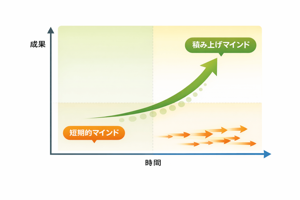 理由としては、これは単なる勤勉さではなく、人生全体を長期的視点で捉え、価値を着実に積み上げる思考だからです。恋愛、仕事、人間関係、学び…あらゆる面で、このマインドがあるかないかで成果や幸福度が大きく変わります。