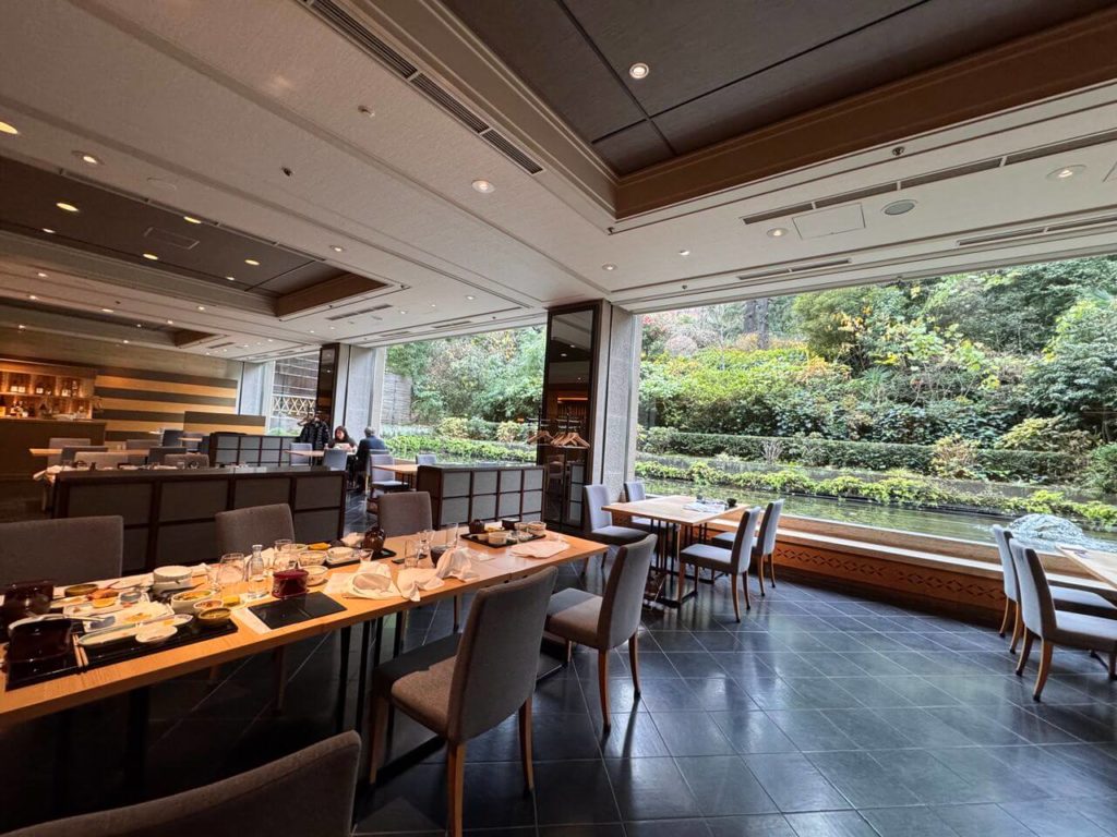 窓の外には整えられた庭園が広がり、四季折々の景色を眺めながら食事をすることができます。訪れるたびに、その美しさに心が和みます。